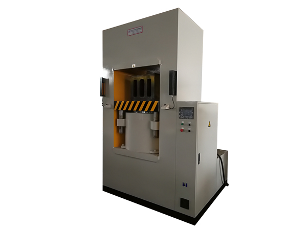 四柱液壓機(jī)包括機(jī)座、立柱、上橫梁、活動橫梁和液壓油缸,立柱固裝在機(jī)座,立柱頂部固裝上橫梁,活動橫梁套裝在立柱上,液壓油缸固裝在上橫梁上,液壓油缸的輸出桿與活動橫梁相連接,帶動活動橫梁沿立柱上下移動,液壓油缸連接柱塞泵,柱塞泵連接液壓控制單元,機(jī)座上設(shè)有若干個壓力傳感器,壓力傳感器與液壓控制單元連接。本產(chǎn)品可將液壓機(jī)的壓力信息反饋到液壓控制單元,液壓控制單元根據(jù)成型工藝參數(shù)快速對液壓油缸的壓力進(jìn)行調(diào)整,使用整個液壓過程的壓力掌控更加穩(wěn)定,滿足不同工藝的需求。壓力傳感器為4個,分別設(shè)置在機(jī)座的4個角上,使測量得到的壓力信號更準(zhǔn)確。